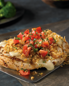 Pechuga de pollo a la parrilla con una costra de crema de queso parmesano y panko con un toque de romero, jitomate cherry fresco con albahaca. Acompañado de vegetales al vapor y fettuccine.