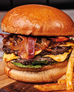 Prueba nuestro ribeye en una hamburguesa, con queso amarillo, cebolla francesa caramelizada y tocino, con un toque de aioli y arúgula. Acompañado de papas fritas.