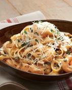 Fettuccine Alfredo con champiñones, queso parmesano y hojuelas de chile, mezclada con camarones salteados.